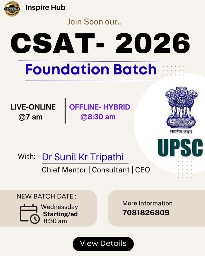 The UPSC-CSE : CSAT – 2026 , Foundation Batch at INSPIRE HUB is designed to help aspirants master Paper II of the Prelims through concept based learning, aligned with the UPSC CSAT syllabus. . CSAT evaluates Aptitude, Reasoning, and Comprehension skills and is the Gateway to the UPSC Main Examination. Whether you are a beginner or a repeater, this program strengthens your foundation and builds the confidence needed to qualify the Prelims, where CSAT is often the real game changer. Skills tested in CSAT, such as reasoning, comprehension, and decision-making, are directly applicable in, Mains essay writing ,Case studies in administrative services ,Policy analysis and governance tasks in real life. CSAT emphasizes accuracy under time pressure.