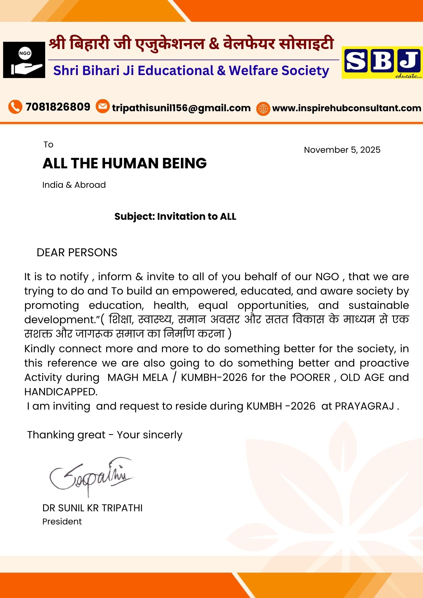 श्री बिहारी जी एजुकेशनल & वेलफेयर सोसाइटी, की स्थापना वर्ष 2016 में की गई थी। यह एक गैर–सरकारी संगठन (NGO) है जो उत्तर प्रदेश तथा पूरे भारत में सामाजिक परिवर्तन और विकास के लिए कार्यरत है।